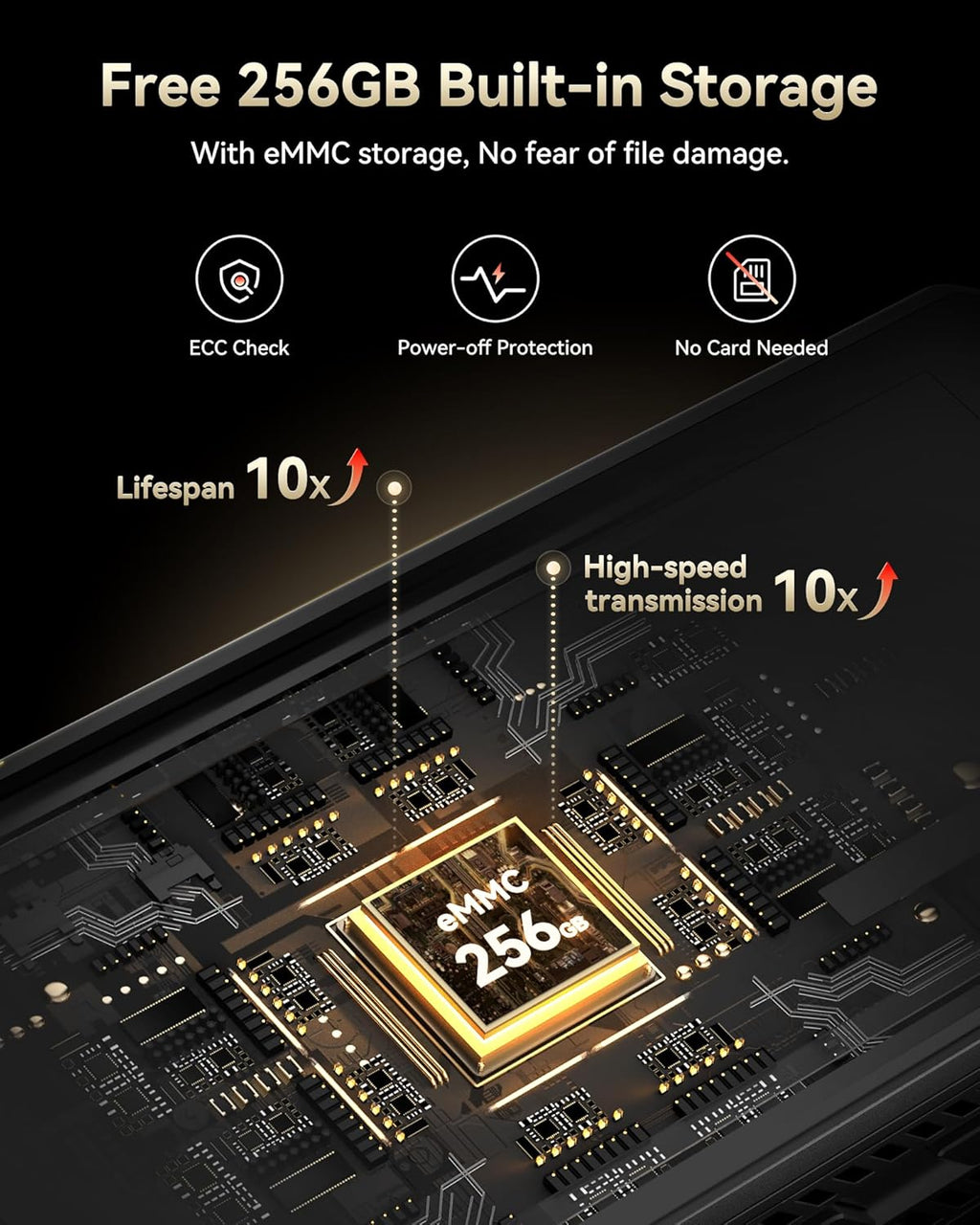 Met een enorme 256GB eMMC-opslag heeft de F77 V2 dashcam geen geheugenkaart nodig. De eMMC kan tot 10 keer vaker worden overschreven dan een gewone kaart en beschikt over ECC-foutcorrectie en stroomuitvalbeveiliging, zodat videobeelden veilig worden opgeslagen bij een botsing — in tegenstelling tot geheugenkaarten die kunnen beschadigen. De REDTIGER 4K dashcam kan urenlang 4K-beelden opslaan, ideaal voor lange ritten of roadtrips.
