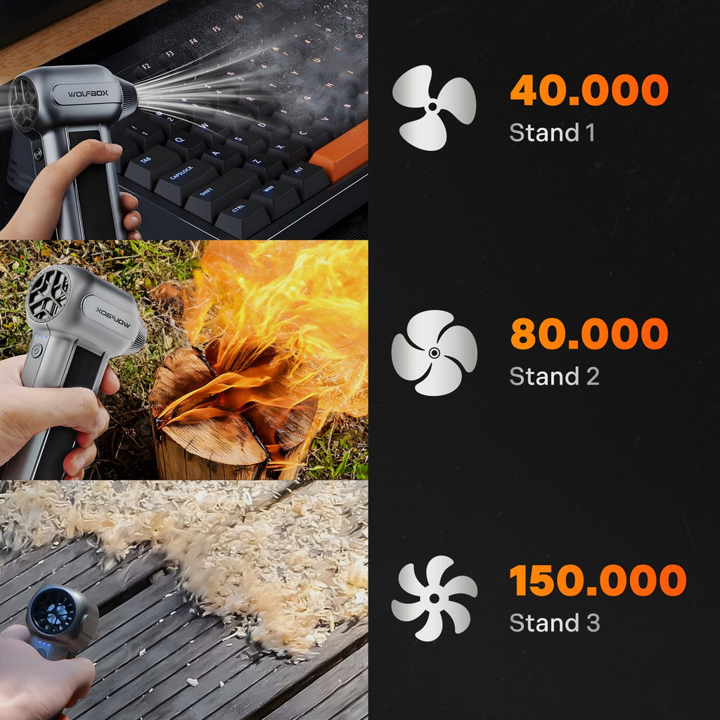 Met een indrukwekkende snelheid tot 150.000 RPM en een krachtige luchtstroom van 45 m/s, blaast de WOLFBOX MegaFlow100 stof en vuil moeiteloos weg. Dankzij de drie verstelbare snelheden pas je de luchtdruk eenvoudig aan op verschillende schoonmaaktaken. Gebruik een lagere stand voor gevoelige apparatuur zoals toetsenborden en camera’s, en schakel naar de hoogste snelheid voor het verwijderen van hardnekkig stof in ventilatoren of autointerieurs. Deze turbo-aangedreven ventilator zorgt ervoor dat je in een fractie van de tijd een grondige reiniging uitvoert.