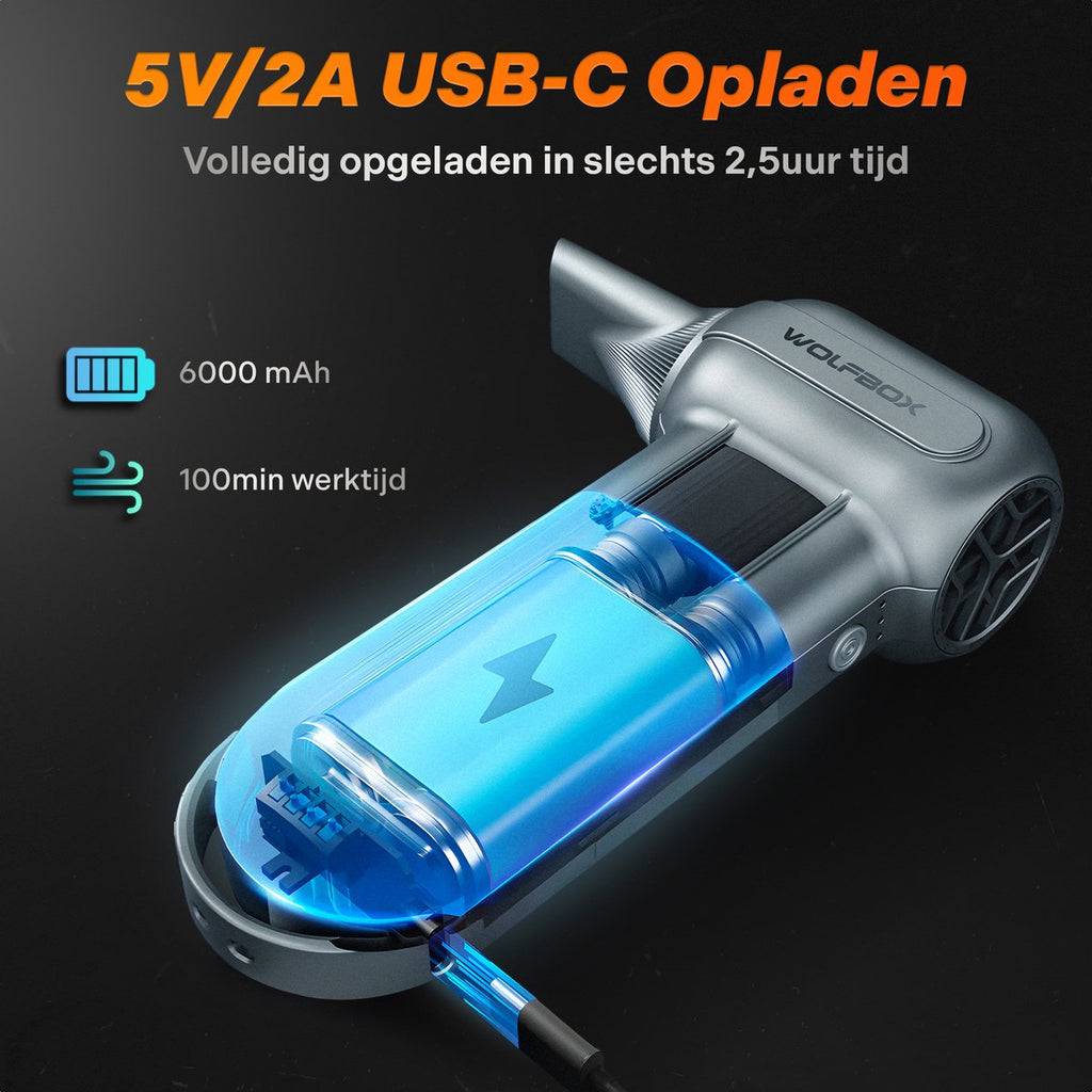 USB-C snelladen: De luchtblazer is volledig opgeladen in slechts 2,5 uur.