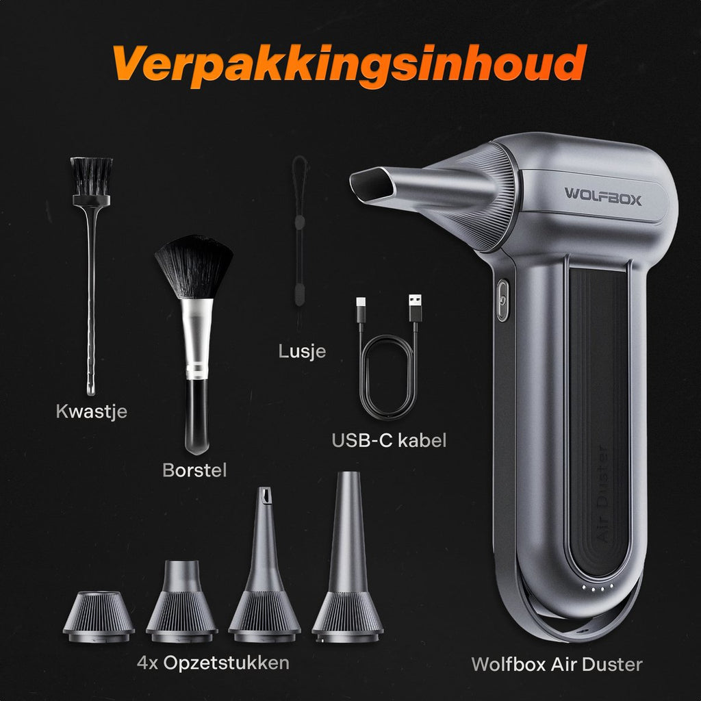 Ben je op zoek naar een efficiënte en milieuvriendelijke manier om stof, vuil en kleine deeltjes te verwijderen? De Wolfbox MegaFlow100 biedt de perfecte oplossing! Met een krachtige turbo-ventilator van 150.000 RPM, een duurzame herbruikbare batterij en meerdere opzetstukken is deze elektrische luchtblazer ideaal voor het schoonmaken van elektronica, auto’s, huishoudelijke apparaten en meer. Bovendien is hij compact, lichtgewicht en gemakkelijk mee te nemen, waardoor je hem altijd bij de hand hebt – thuis, op kantoor of onderweg.