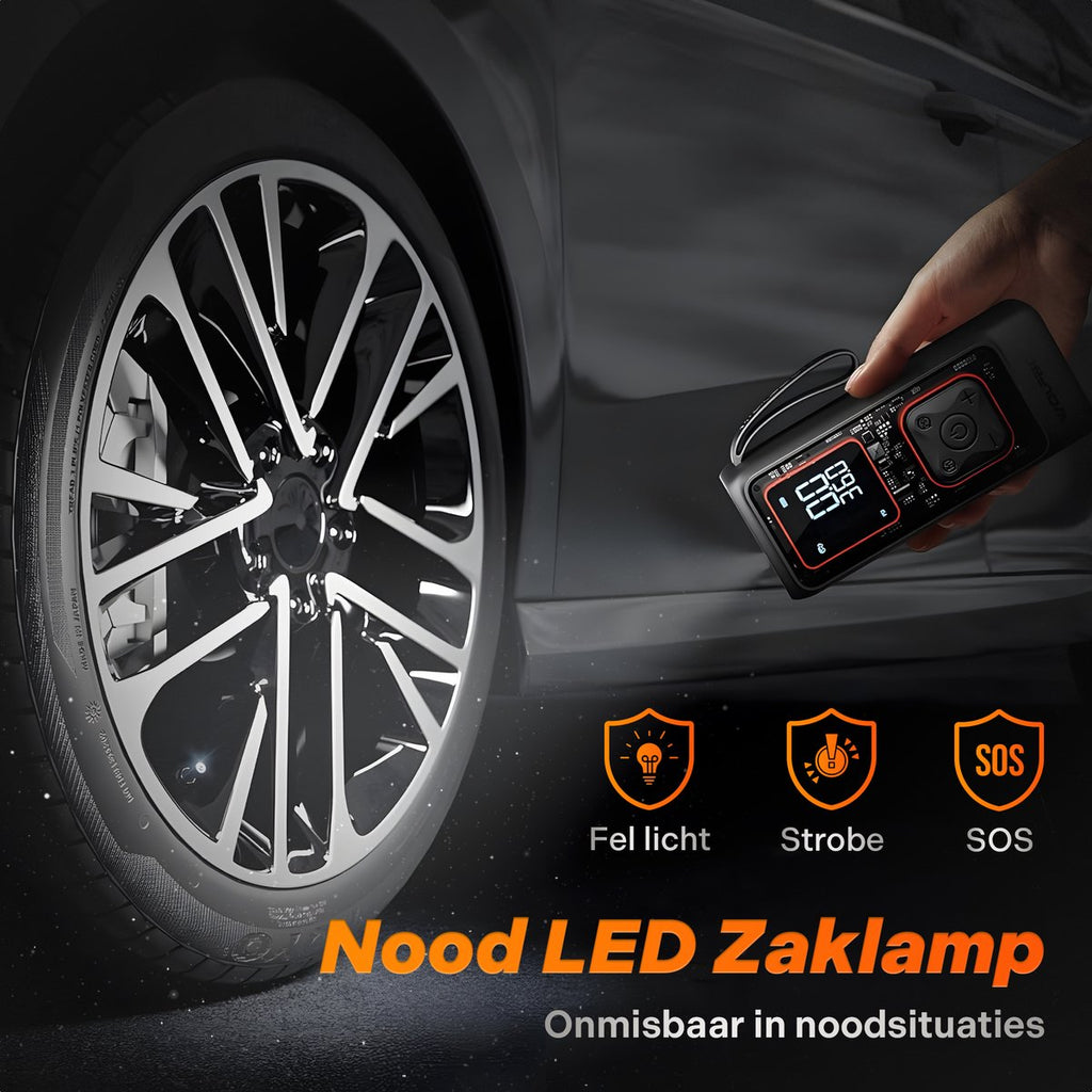 - Krachtige feitelijke batterij: De 12000mAh accu is goed voor maar liefst 24 bandenvullingen op één lading. Bij een lege batterij kun je via de 11ft autostroomkabel (sigarettenaansteker) ga door met oppompen.