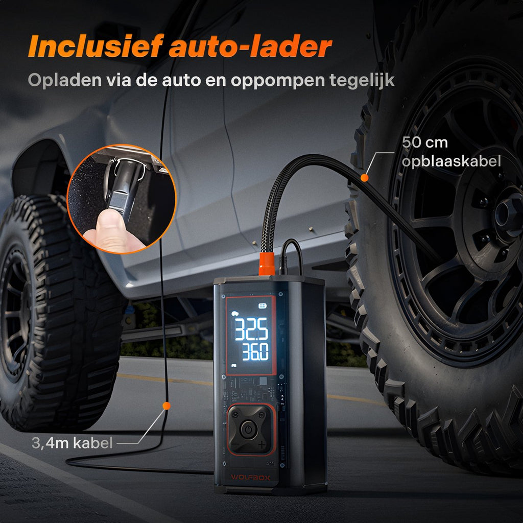 Met de Wolfbox MegaFlow pro luchtcompressor bespaar je kostbare tijd bij het oppompen van je banden. Dankzij de krachtige 60 LPM dubbele cilindermotor is deze pomp in staat om een standaard autoband (maat 185/55/R14) volledig op te pompen in slechts 35 seconden . Voor SUV-banden (225/45/R17) duurt dit slechts 50 seconden, en voor grotere pick-up truckbanden (maat 315/70/R17) slechts 4 minuten , binnen een drukbereik van 29 tot 36 PSI. Geen gedoe meer bij tankstations of wachten op pechhulp — je bent binnen enkele minuten weer veilig onderweg.